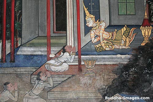 One night, King Ekaraja dreamed of a glorious bejeweled heaven populated by celestial beings. When he awoke, he was seized by an overpowering desire to enter this radiant world. Having little religious insight himself, he went out onto the porch of his royal hall and bade his chief Brahmin to come to him. Still dazzled by his vision, he asked Khandahala to tell him the way to this resplendent abode. Khandahala saw that this was his moment for revenge. As he knelt before the king , he said, "It will not be easy for you to find this realm, and it will cost you dearly. You must offer a splendid sacrifice to the gods. It must be made in units of four. Only such a gift can win the attention of those on high. Sons, queens, merchants, beasts, these four kinds, sacrificed with proper ritual, will gain you entrance into this heaven."