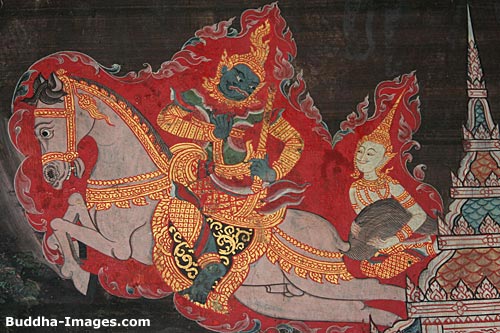 At that time a yakkha, or demon, named Punnaka was riding on his magic horse over the Black Mountain. Hearing Irandati's love call, he stopped short, listened, and changed his course to ride over to her. Completely enamored, he resolved to marry her. Together they rode to the palace to ask her father's permission to be joined in wedlock. The king secretly rejoiced that his plan was bearing fruit, but to Punnaka he sternly announced that he would agree to the marriage only on one condition : that Punnaka first obtain the flesh of the heart of Vidhura.